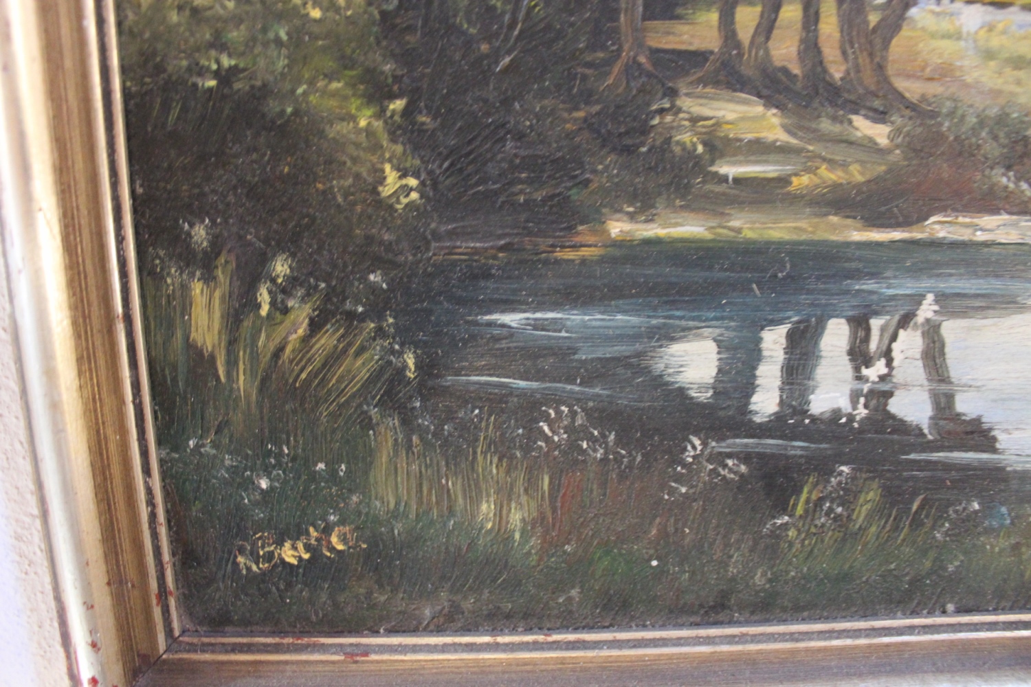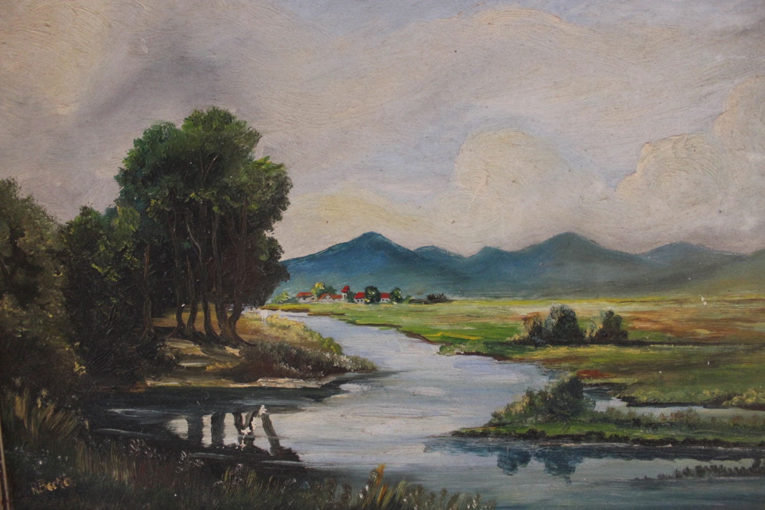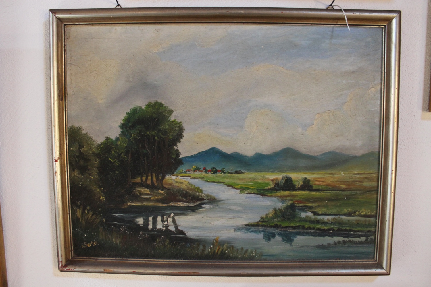 Altes Bild, Oel auf LeinwandLandschaft mit Flussin Silberrahmen.