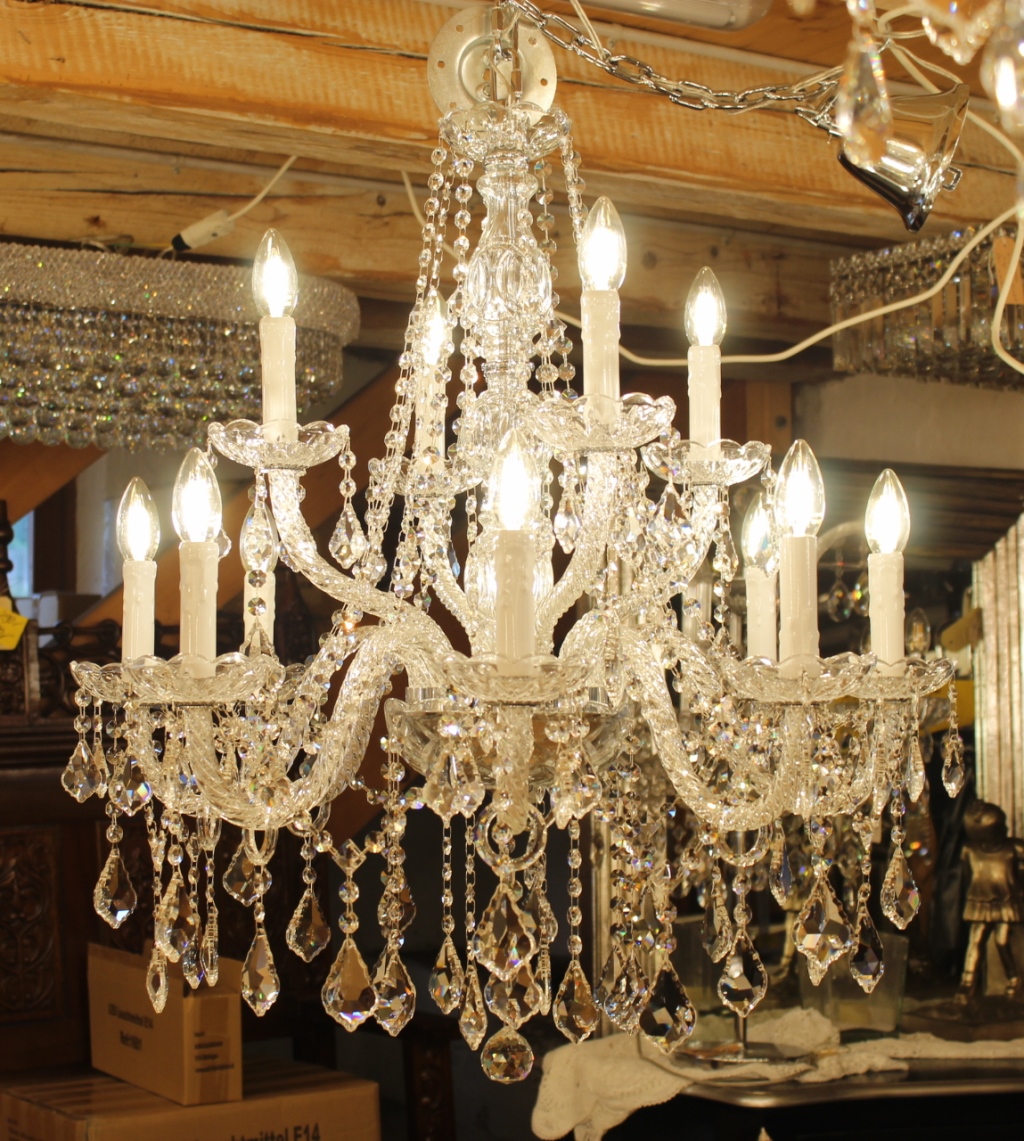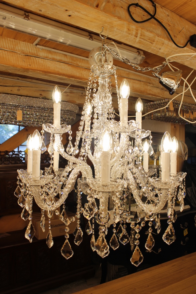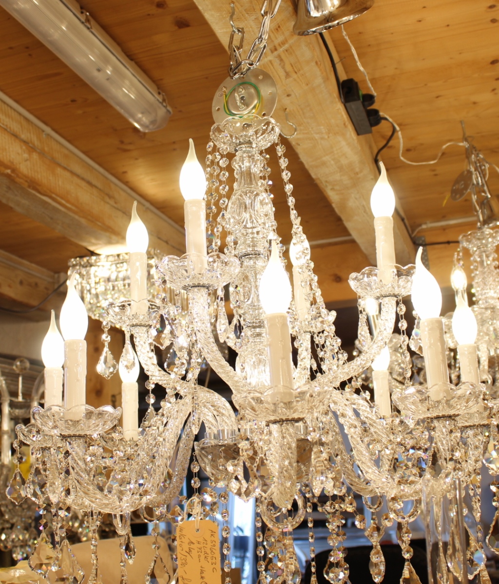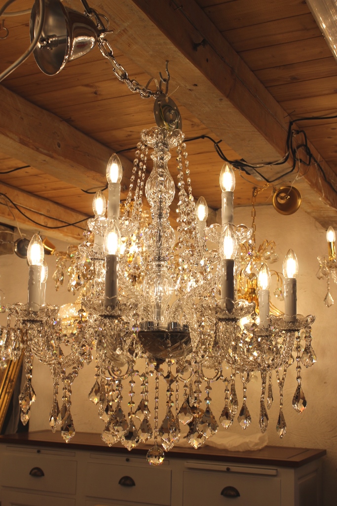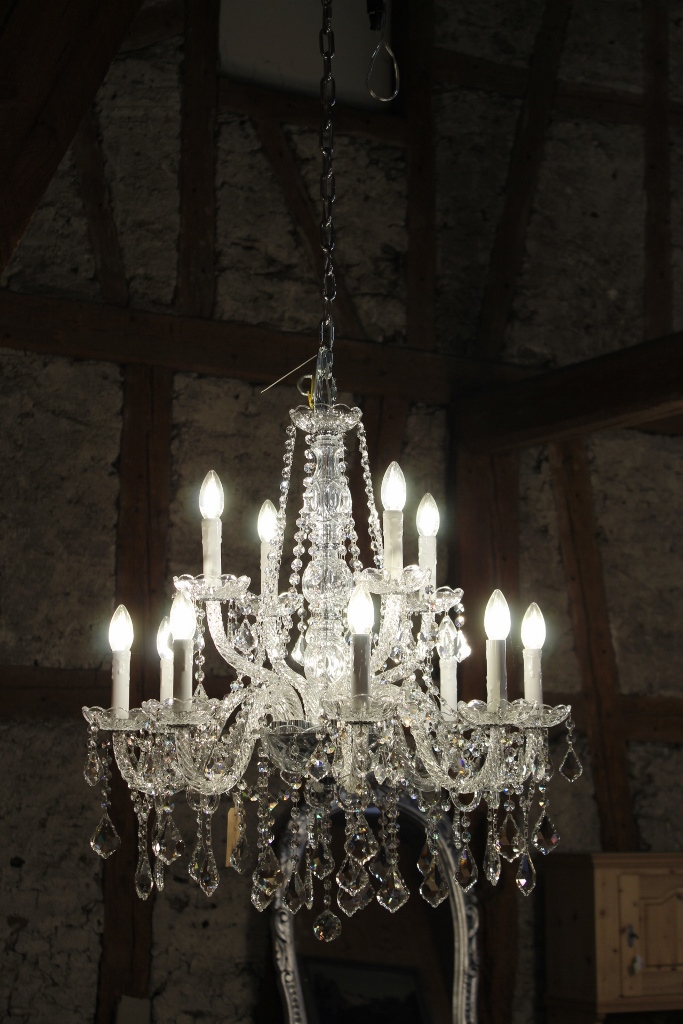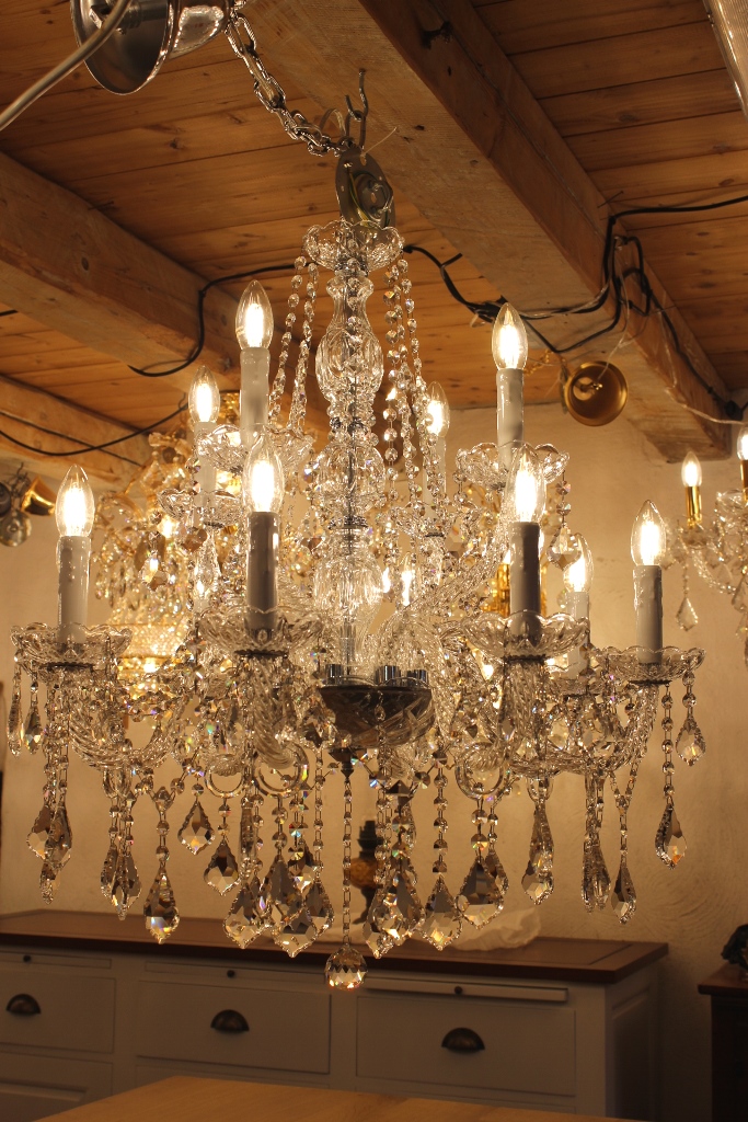 Insgesamt hat dieser Lüster 12 Lichter, 220 Volt / 40 Watt