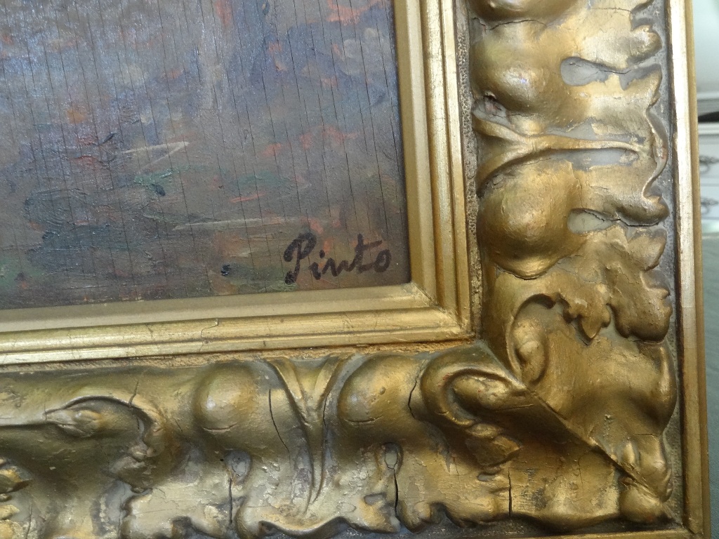 Ölgemälde Berglandschaft.Das Bild ist in einem schönen verzierten antiken Goldrahmen.Signiert mit Pinto
